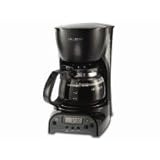 Perfect for one- to two-person households, this coffeemaker brews up to 4 cups of fresh, flavorful coffee at a time. The programmable unit can be set up to 24 hours in advance for "wake up" coffee or to have a pot ready and waiting to serve with dessert--no need to get up from the table half way through dinner. For those eager to get a jump start on their day, the machine's brew-pause function allows for pouring a quick cup midbrew--simply remove the carafe to pause the flow of coffee, pour a cup, then replace the carafe to continue the brewing cycle. The included carafe offers measuring marks up the side, an ergonomic stay-cool handle, and a drip-free spout for graceful pouring. The coffeemaker also provides dual water-level windows that show the amount of water in the reservoir for accurate filling, a two-hour automatic shut-off function that keeps coffee warm for two hours before automatically shutting off, and a removable filter basket that lifts out of the brew basket for convenient removal of coffee grounds. Other highlights include an on/off indicator light, a stain-resistant warming plate, water filter adaptability, and cord storage to keep countertops looking neat and tidy. The coffeemaker measures approximately 9 by 6-1/2 by 10-1/2 inches and carries a one-year limited warranty.